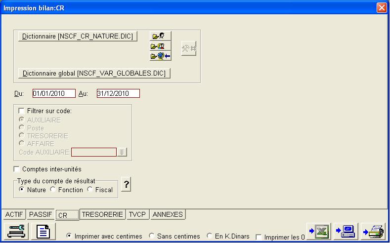 le TCR est imprimé en 3 colonnes: Comptes normales; Comptes inter-unités; et le Total. Une valeur inter-unité est calculé selon la formule du compte normal en ajoutant au début le chiffre 89.