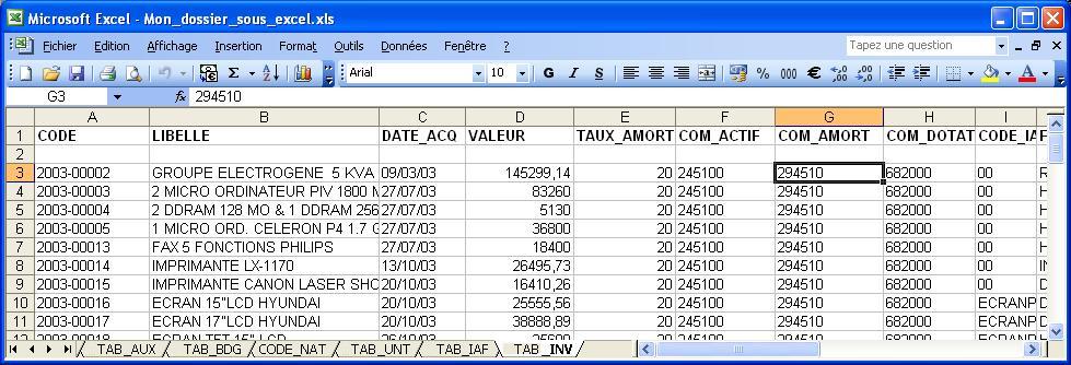La colonne CODE_IAF peut préciser l'affectation de l'investissement. La feuille TAB_IAF peut contenir la liste des affectations (CODE et LIBELLE). Même principe pour les deux autres tables TAB_ITP-Type investissements et TAB_INT-Nature investissement.