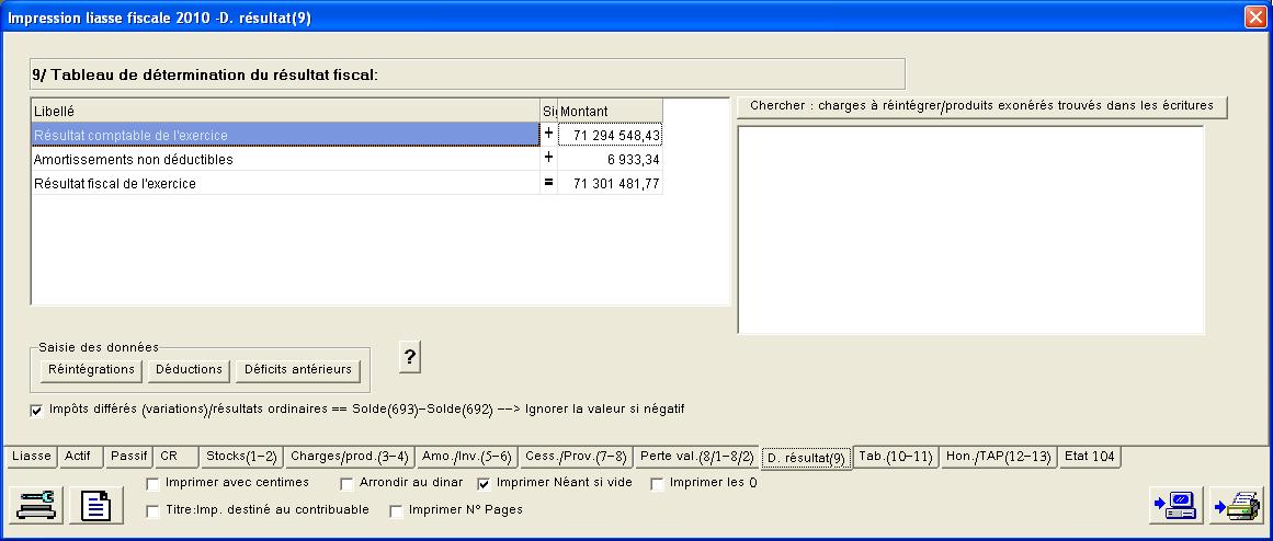 Important: Ces deux dernières lignes sont calculées automatiquement dès l'affichage de la fenêtre de liasse fiscale. Si vous modifiez manuellement ces deux valeurs; cette modification n'est pas mémorisée ( il n'est mémorisée que le moment de l'affichage de la fenêtre).