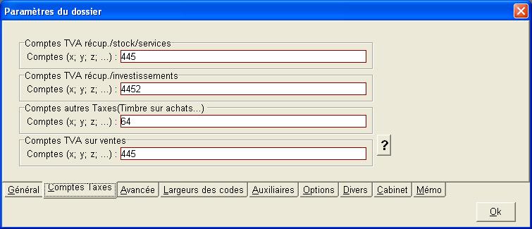 Le cadre Comptes Autres Taxes (Timbre sur achats...) Comptes Taxes à ne pas inclure dans le Hors Taxe. Le montant Hors Taxe de la facture est déterminé en totalisant les comptes au débit sauf les comptes de taxes comme le timbre fiscal par exemple. S'il y a d'autres taxes spécifiques, il suffit de les rajouter ici. Par défaut, le compte 64 est paramétré.