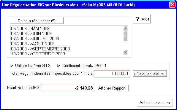 Cette fenêtre se trouve sur l'Onglet Valeurs d'un salarié->Menu contextuel de la grille Valeurs->Outils->Régularisation IRG sur plusieurs Mois